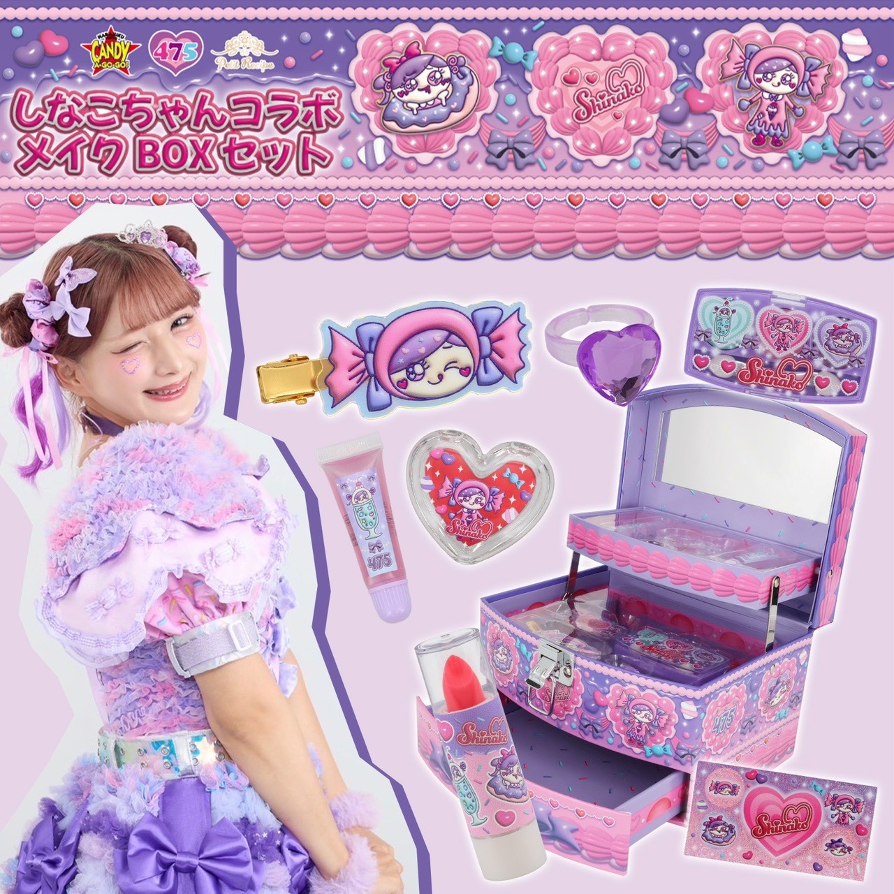 株式会社CANDY•A•GO•GO(本社:東京都渋谷区、代表取締役:落合琢)は、 化粧品、化粧雑貨、服飾雑貨及びキャラクター雑貨等の企画・製造・販売、コンタクトレンズの企画・販売を行う粧美堂株式会社(本社:東京都港区、代表取締役社長:寺田正秀、以下 粧美堂)は、「しなこちゃんコラボ メイクBOXセット」を共同開発し、粧美堂公式オンラインストア、CANDY A☆GO☆GO!※、アピタ/ピアゴ※にて2026年3月27日(金)より先行発売を開始しました。※一般発売は4月1日を予定しております。